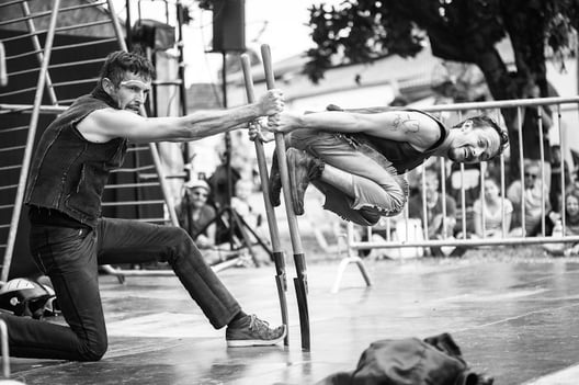 Dans une ambiance blues détonante, ils se mettent à l’épreuve dans des jeux d’équilibres. Ils jouent d’un rien, tout en détournant pelles bêches et barrières Vauban, le temps d’une performance absurde et périlleuse.
